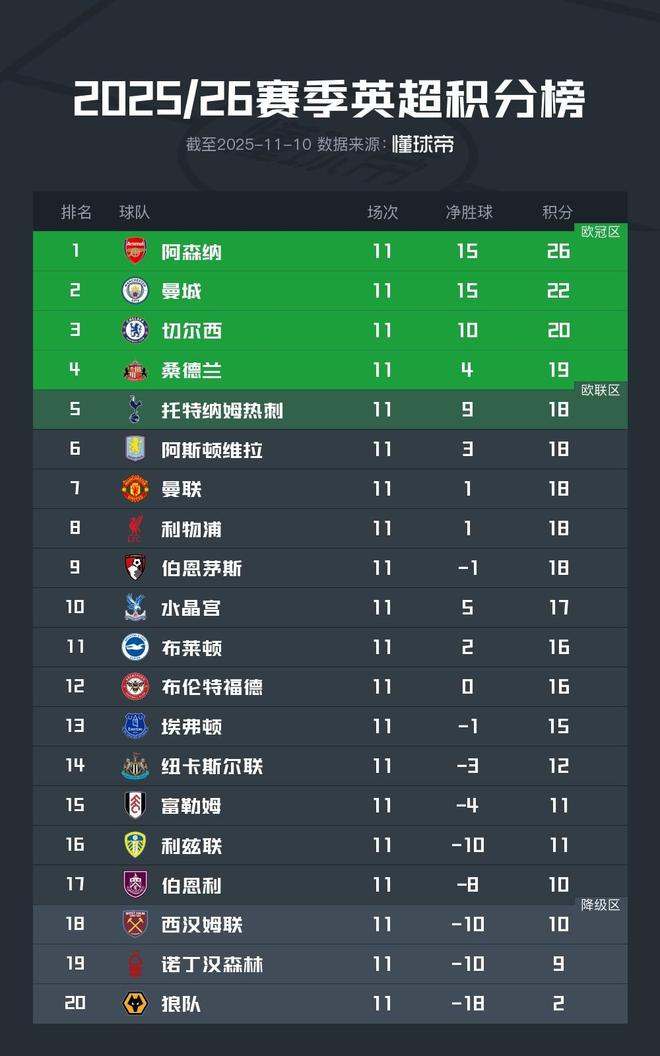 北京时间11月10日,2025/26赛季英超联赛结束了第11轮的全部较量,积分榜的形势也产生了进一步的变化。